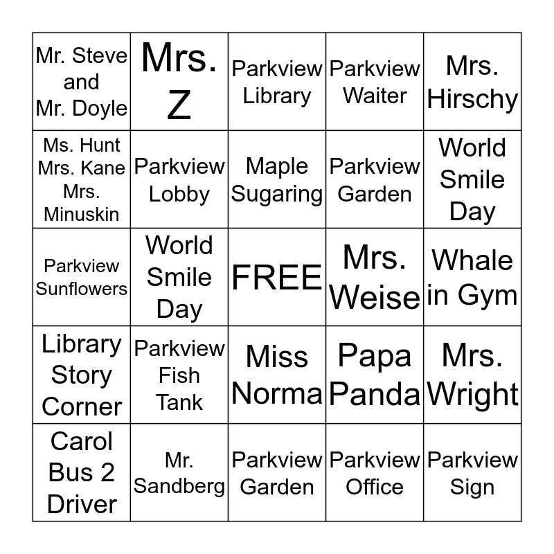 This bingo card has a free space and 24 words: Parkview Fish Tank, Mr. Sandberg, Maple Sugaring, Carol Bus 2 Driver, Mrs. Hirschy, Mr. Steve and Mr. Doyle, Ms. Hunt Mrs. Kane Mrs. Minuskin, Mrs. Z, Mrs. Weise, Miss Norma, Parkview Garden, Parkview Sunflowers, Papa Panda, Mrs. Wright, Parkview Lobby, Parkview Office, Whale in Gym, Parkview Library, World Smile Day, World Smile Day, Parkview Sign, Library Story Corner, Parkview Waiter and Parkview Garden.