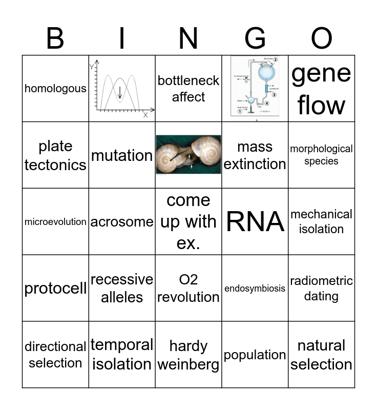 This bingo card has 4 images, a free space and 25 words: directional selection, trisomy, acrosome, relative fitness, homologous, bottleneck affect, mutation, recessive alleles, RNA, temporal isolation, mechanical isolation, natural selection, hardy weinberg, population, morphological species, founder effect, O2 revolution, protocell, gene flow, microevolution, endosymbiosis, cambrian explosion, mass extinction, plate tectonics and radiometric dating.