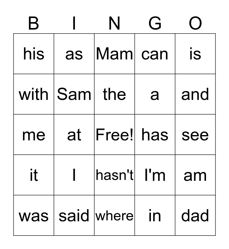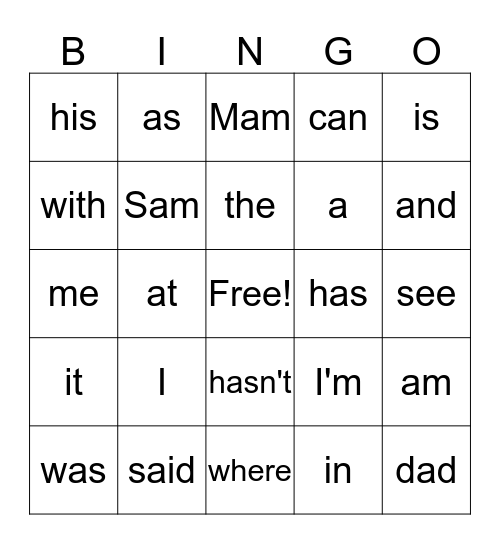 This bingo card has a free space and 24 words: I, said, the, was, is, his, with, as, has, hasn't, a, me, I'm, am, Sam, in, see, Mam, and, at, dad, it, can and where.