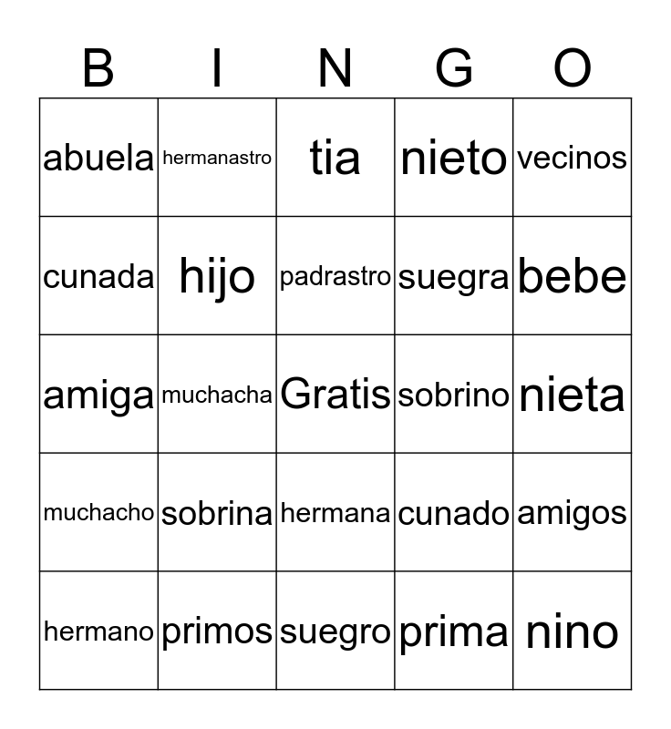 This bingo card has 39 words: esposa, esposo, hija, hijo, hermano, hermana, padrastro, madrastra, vecinos, muchacho, muchacha, nieto, Gratis, nieta, sobrino, sobrina, abuelos, abuela, abuelo, cunado, cunada, suegro, suegra, bebe, ninos, nina, nino, madre, padre, hermanastro, hermanastra, tio, tia, primos, prima, primo, amigos, amiga and amigo.