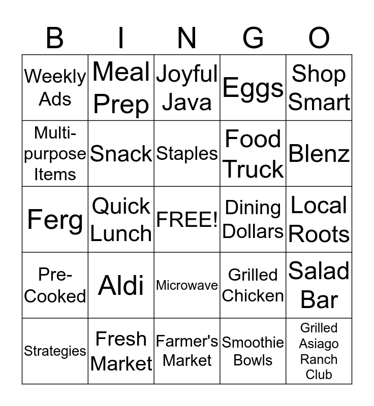 This bingo card has a free space and 24 words: Aldi, Fresh Market, Staples, Strategies, Shop Smart, Weekly Ads, Multi-purpose Items, Meal Prep, Dining Dollars, Microwave, Food Truck, Ferg, Grilled Chicken, Salad Bar, Snack, Smoothie Bowls, Local Roots, Joyful Java, Blenz, Quick Lunch, Grilled Asiago Ranch Club, Pre- Cooked, Eggs and Farmer's Market.