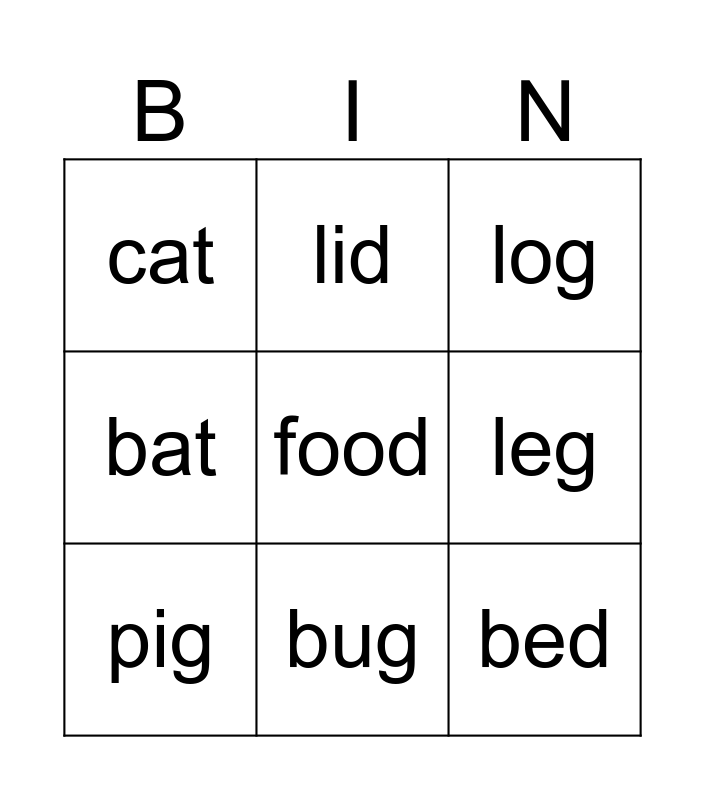This bingo card has a free space and 8 words: leg, log, lid, pig, cat, bed, bat and bug.