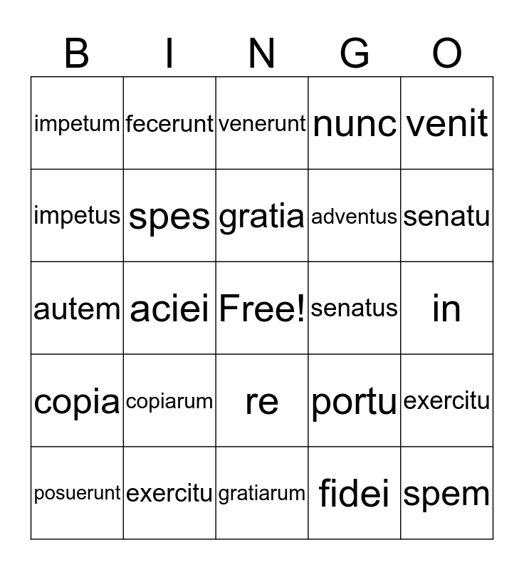 This bingo card has a free space and 39 words: res, fides, acies, spes, posuerunt, re, gratia, aciebus, venit, copia, aciei, nunc, spem, in, senatus, copiarum, metum, impetum, portus, portu, impetus, gratiarum, adventus, senatu, copiae, metus, rerum, spiritus, agunt, fecerunt, aquitatus, exercitus, venerunt, exercitu, fidei, spei, exercitu, autem and rei.