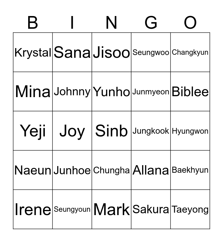 This bingo card has a free space and 24 words: Junhoe, Seungyoun, Yunho, Irene, Changkyun, Krystal, Mina, Sana, Jungkook, Chungha, Junmyeon, Yeji, Allana, Baekhyun, Johnny, Sakura, Hyungwon, Jisoo, Biblee, Joy, Taeyong, Naeun, Seungwoo and Mark.