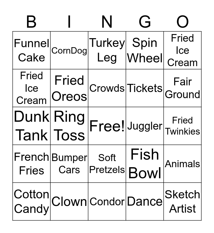 This bingo card has a free space and 29 words: Cotton Candy, Roller Coaster, Ring Toss, Photo Booth, Funnel Cake, Turkey Leg, Fried Oreos, Bumper Cars, Juggler, Clown, Fried Twinkies, Sketch Artist, Condor, Dance, Fair Ground, Fried Pickels, Soft Pretzels, French Fries, Fried Ice Cream, Dunk Tank, Fish Bowl, Prizes, Tickets, Fried Ice Cream, Spin Wheel, CornDog, Animals, Crowds and Basketball.