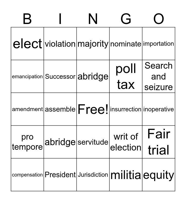 This bingo card has a free space and 29 words: compensation, requisite, assemble, census, elect, majority, Successor, abridge, insurrection, President, inoperative, equity, Jurisdiction, militia, Search and seizure, entitle, servitude, pro tempore, importation, amendment, writ of election, ratification, poll tax, emancipation, nominate, violation, Fair trial, abridge and territory.