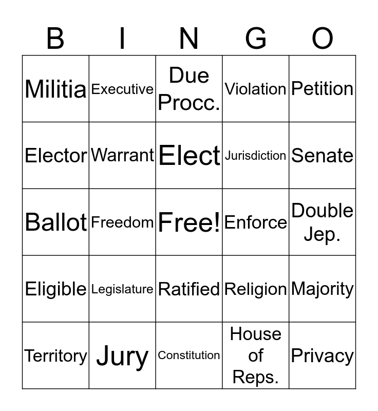 This bingo card has a free space and 24 words: Legislature, Jury, Elect, Territory, Petition, Militia, Elector, Executive, Enforce, Ratified, Jurisdiction, Ballot, Religion, Majority, Warrant, House of Reps., Double Jep., Due Procc., Senate, Freedom, Privacy, Eligible, Violation and Constitution.