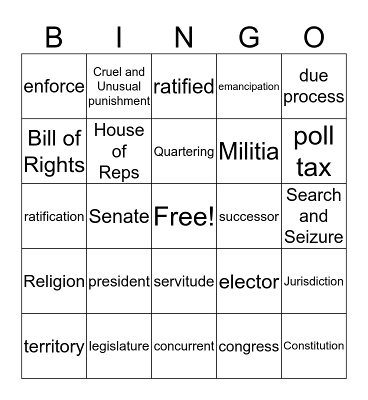 This bingo card has a free space and 24 words: president, legislature, Quartering, territory, due process, enforce, Bill of Rights, Cruel and Unusual punishment, successor, servitude, Militia, ratification, elector, Jurisdiction, House of Reps, congress, Search and Seizure, ratified, poll tax, Senate, Constitution, Religion, emancipation and concurrent.