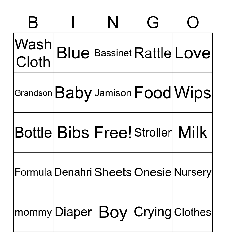 This bingo card has a free space and 24 words: Denahri, Diaper, Jamison, mommy, Love, Wash Cloth, Grandson, Blue, Stroller, Sheets, Food, Bottle, Onesie, Nursery, Baby, Crying, Milk, Bassinet, Wips, Bibs, Clothes, Formula, Rattle and Boy.