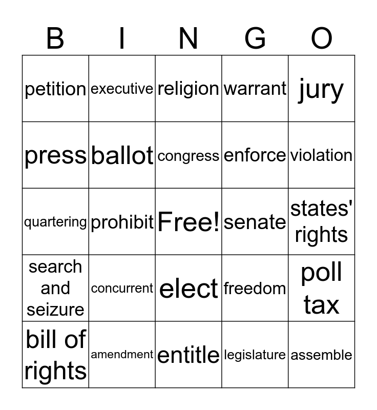 This bingo card has a free space and 24 words: concurrent, amendment, congress, bill of rights, jury, petition, press, executive, senate, elect, enforce, quartering, freedom, poll tax, ballot, legislature, states' rights, religion, violation, prohibit, assemble, search and seizure, warrant and entitle.