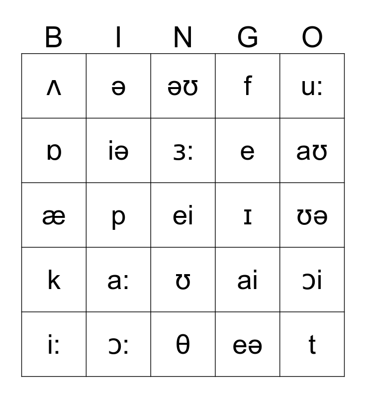 This bingo card has a free space and 24 words: a:, ɔ:, ɜ:, i:, u:, ʌ, ɒ, ə, ɪ, ʊ, e, æ, ai, ɔi, iə, eə, ʊə, əʊ, aʊ, p, t, k, f and θ.