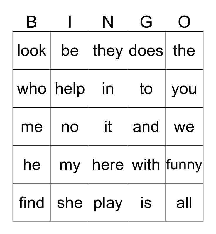 This bingo card has 25 words: he, she, it, is, the, look, be, they, and, funny, who, help, play, with, you, find, no, in, to, we, me, my, here, does and all.