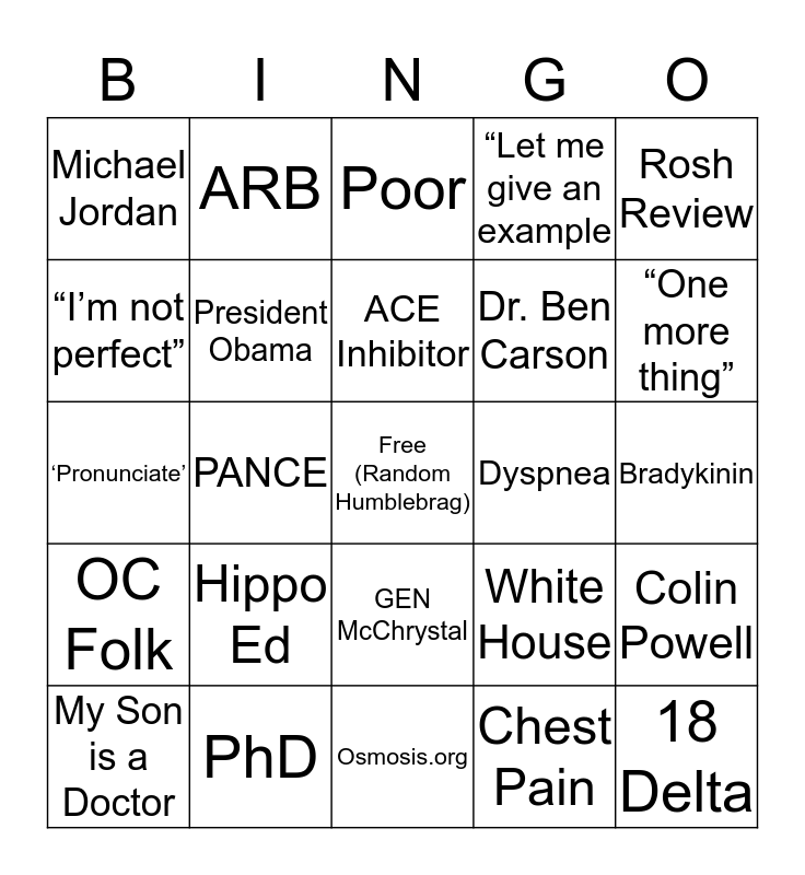 This bingo card has a free space and 24 words: Hippo Ed, PhD, ACE Inhibitor, My Son is a Doctor, Rosh Review, Michael Jordan, “I’m not perfect”, ARB, Dyspnea, GEN McChrystal, Dr. Ben Carson, ‘Pronunciate’, White House, Colin Powell, President Obama, Chest Pain, Bradykinin, Poor, “One more thing”, PANCE, 18 Delta, OC Folk, “Let me give an example and Osmosis.org.