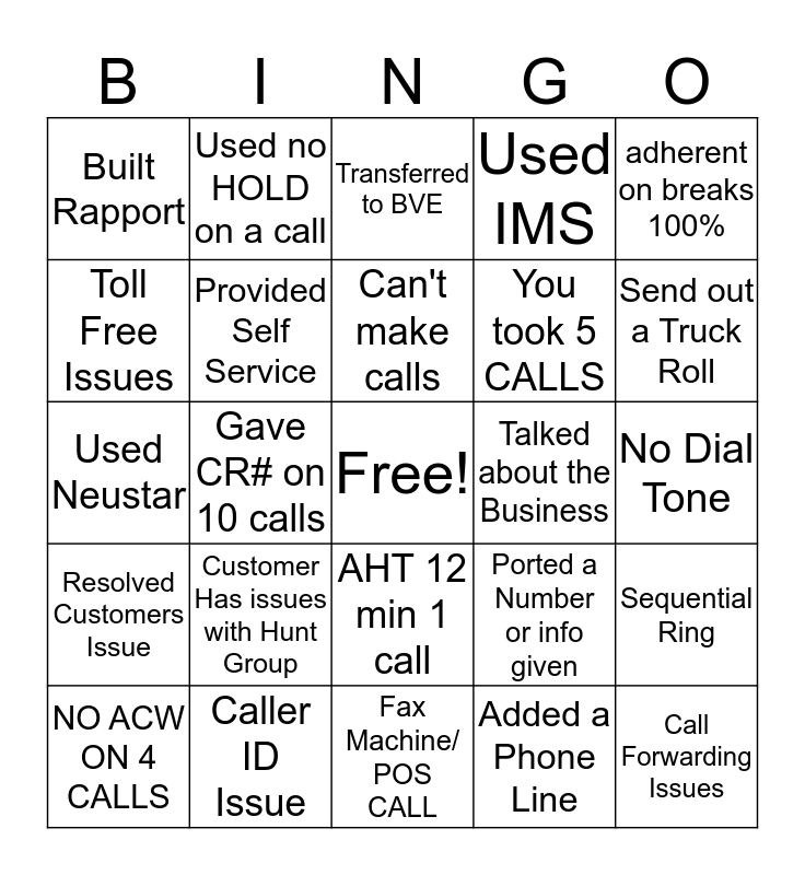 This bingo card has a free space and 24 words: Customer Has issues with Hunt Group, Caller ID Issue, Can't make calls, NO ACW ON 4 CALLS, adherent on breaks 100%, Built Rapport, Toll Free Issues, Used no HOLD on a call, Talked about the Business, AHT 12 min 1 call, You took 5 CALLS, Used Neustar, Ported a Number or info given, Sequential Ring, Provided Self Service, Added a Phone Line, No Dial Tone, Transferred to BVE, Send out a Truck Roll, Gave CR# on 10 calls, Call Forwarding Issues, Resolved Customers Issue, Used IMS and Fax Machine/ POS CALL.