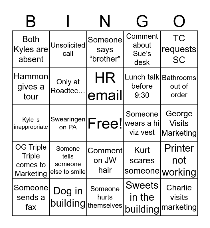 This bingo card has a free space and 26 words: Comment on JW hair, Sweets in the building, HR email, Dog in building, TC requests SC, Both Kyles are absent, Hammon gives a tour, Unsolicited call, George Visits Marketing, Kurt scares someone, Lunch talk before 9:30, Kyle is inappropriate, Printer not working, Someone sends a fax, Swearingen on PA, Ben’s household changes, Comment about Sue’s desk, OG Triple Triple comes to Marketing, Someone says “brother”, Charlie visits marketing, Bathrooms out of order, Someone hurts themselves, Someone wears a hi viz vest, Somone tells someone else to smile, Only at Roadtec… and Cryptic text received from J Star.