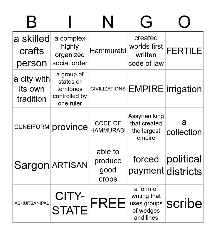 This bingo card has a free space and 24 words: ARTISAN, CITY-STATE, CIVILIZATIONS, ASHURBANIPAL, FERTILE, a skilled crafts person, a city with its own tradition, a complex highly organized social order, Assyrian king that created the largest empire, able to produce good crops, EMPIRE, CUNEIFORM, forced payment, political districts, a group of states or territories controlled by one ruler, a form of writing that uses groups of wedges and lines, a collection, Hammurabi, irrigation, province, scribe, Sargon, created worlds first written code of law and FREE.