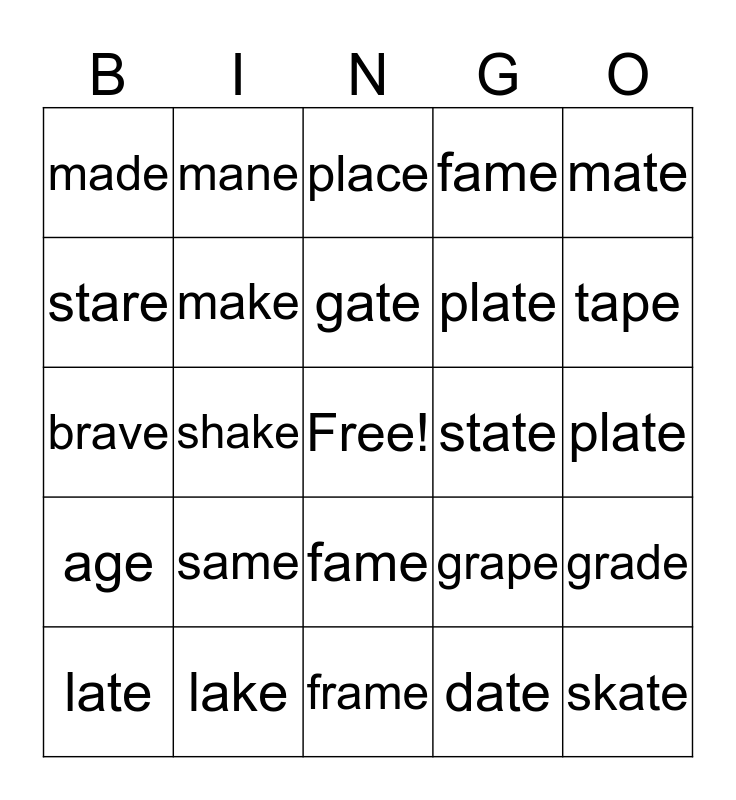 This bingo card has a free space and 24 words: same, lake, gate, late, mate, made, stare, mane, state, fame, plate, brave, grape, grade, make, date, plate, place, tape, shake, skate, age, fame and frame.