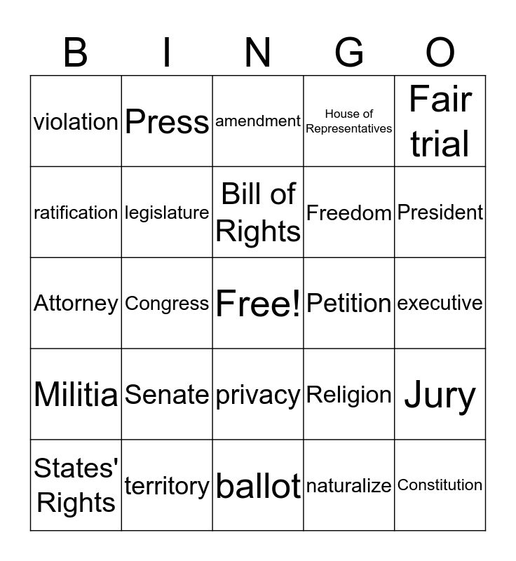 This bingo card has a free space and 24 words: Senate, territory, Bill of Rights, States' Rights, Fair trial, violation, ratification, Press, Petition, privacy, Freedom, Attorney, Religion, Jury, legislature, naturalize, executive, amendment, President, Congress, Constitution, Militia, House of Representatives and ballot.