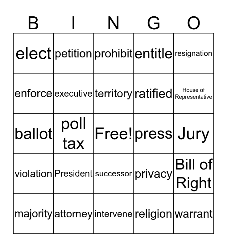 This bingo card has a free space and 24 words: President, attorney, territory, majority, resignation, elect, enforce, petition, press, successor, ratified, ballot, privacy, Bill of Right, executive, religion, Jury, prohibit, House of Representative, poll tax, warrant, violation, entitle and intervene.
