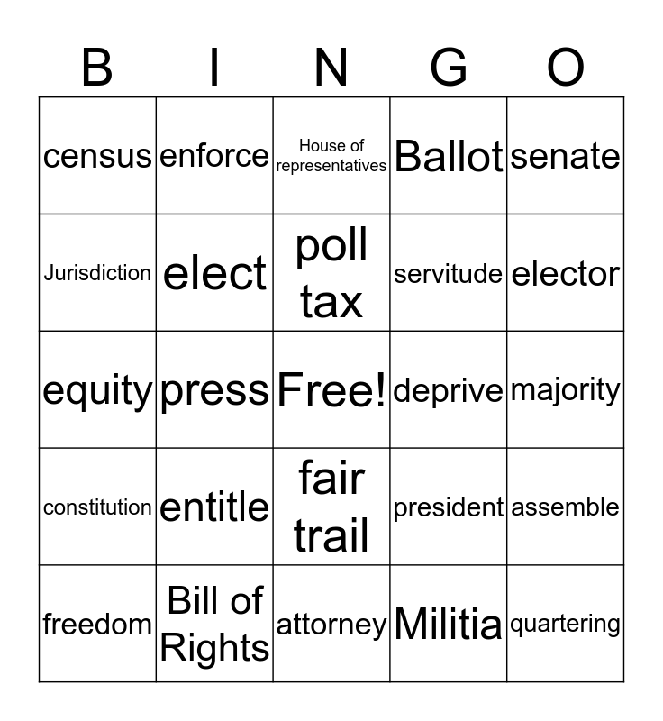 This bingo card has a free space and 24 words: entitle, Bill of Rights, poll tax, freedom, senate, census, Jurisdiction, enforce, deprive, fair trail, servitude, equity, president, assemble, elect, Militia, majority, House of representatives, elector, press, quartering, constitution, Ballot and attorney.