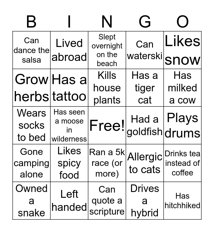 This bingo card has a free space and 24 words: Likes spicy food, Left handed, Kills house plants, Owned a snake, Likes snow, Can dance the salsa, Grow herbs, Lived abroad, Had a goldfish, Ran a 5k race (or more), Has a tiger cat, Wears socks to bed, Allergic to cats, Drinks tea instead of coffee, Has a tattoo, Drives a hybrid, Plays drums, Slept overnight on the beach, Has milked a cow, Has seen a moose in wilderness, Has hitchhiked, Gone camping alone, Can waterski and Can quote a scripture.