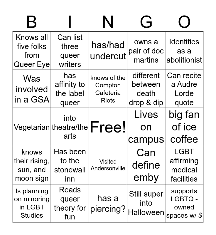 This bingo card has a free space and 24 words: Has been to the stonewall inn, Reads queer theory for fun, knows of the Compton Cafeteria Riots, Is planning on minoring in LGBT Studies, Identifies as a abolitionist, Knows all five folks from Queer Eye, Was involved in a GSA, Can list three queer writers, Lives on campus, Visited Andersonville, different between death drop & dip, Vegetarian, Can define emby, LGBT affirming medical facilities, has affinity to the label queer, Still super into Halloween, big fan of ice coffee, has/had undercut, Can recite a Audre Lorde quote, into theatre/the arts, supports LGBTQ -owned spaces w/ $, knows their rising, sun, and moon sign, owns a pair of doc martins and has a piercing?.