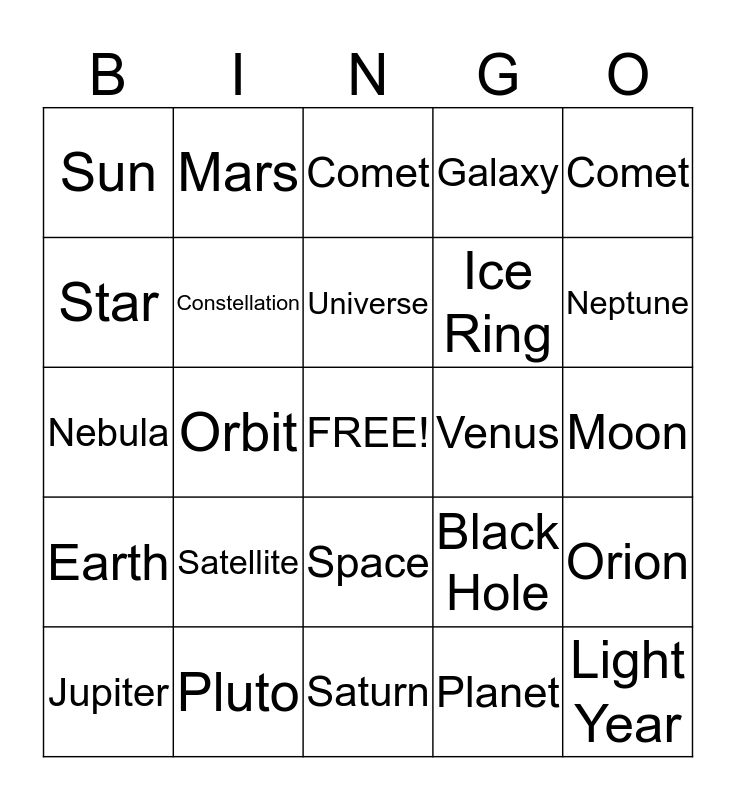 This bingo card has a free space and 24 words: Satellite, Pluto, Universe, Jupiter, Comet, Sun, Star, Mars, Venus, Space, Ice Ring, Nebula, Black Hole, Orion, Constellation, Planet, Moon, Comet, Neptune, Orbit, Light Year, Earth, Galaxy and Saturn.
