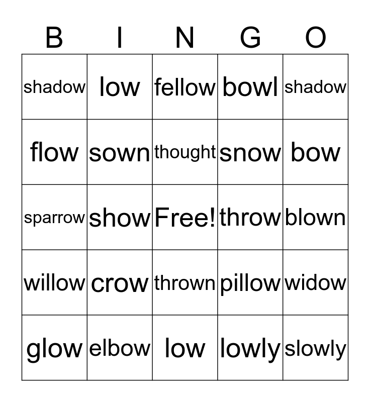 This bingo card has a free space and 31 words: low, mellow, show, hollow, shadow, fellow, sown, pillow, throw, lowly, blown, slowly, follow, own, bow, row, widow, crow, willow, thrown, shadow, yellow, glow, low, snow, flow, bowl, sparrow, elbow, thought and whose.