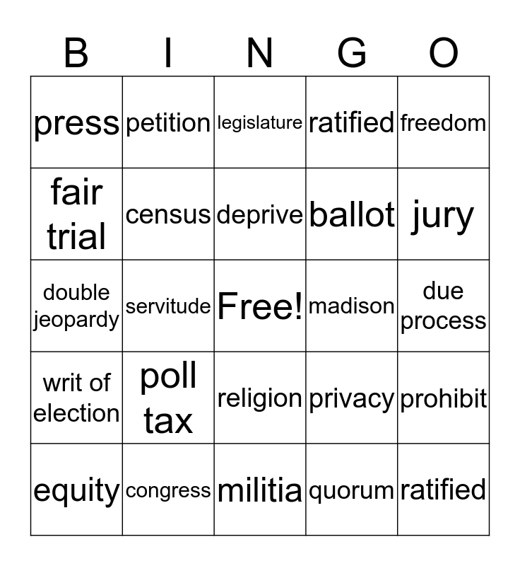 This bingo card has a free space and 24 words: poll tax, congress, deprive, equity, freedom, press, fair trial, petition, madison, religion, ballot, double jeopardy, privacy, prohibit, census, quorum, due process, legislature, jury, servitude, ratified, writ of election, ratified and militia.