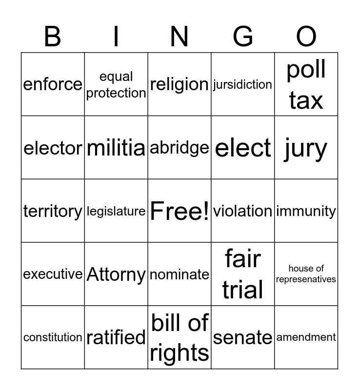 This bingo card has a free space and 24 words: Attorny, ratified, abridge, constitution, poll tax, enforce, elector, equal protection, violation, nominate, elect, territory, fair trial, house of represenatives, militia, senate, immunity, religion, jury, legislature, amendment, executive, jursidiction and bill of rights.