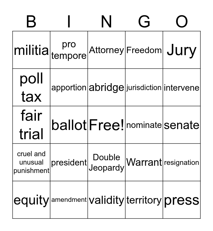 This bingo card has a free space and 24 words: president, amendment, abridge, equity, Jury, militia, poll tax, pro tempore, nominate, Double Jeopardy, jurisdiction, fair trial, Warrant, resignation, apportion, territory, senate, Attorney, intervene, ballot, press, cruel and unusual punishment, Freedom and validity.