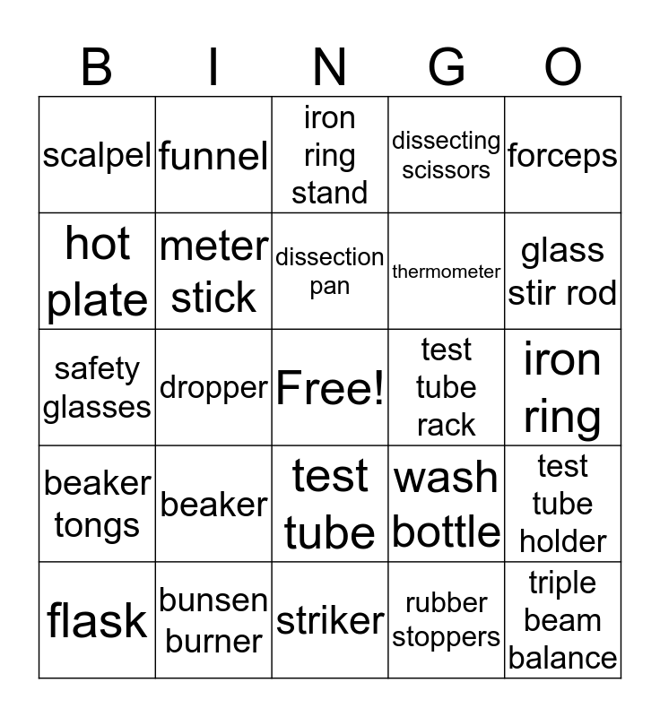 This bingo card has a free space and 24 words: beaker, bunsen burner, dissection pan, flask, forceps, scalpel, hot plate, funnel, test tube rack, test tube, thermometer, safety glasses, wash bottle, test tube holder, meter stick, rubber stoppers, iron ring, iron ring stand, glass stir rod, dropper, triple beam balance, beaker tongs, dissecting scissors and striker.