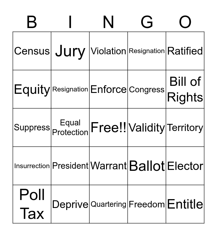 This bingo card has a free space and 24 words: President, Deprive, Enforce, Poll Tax, Ratified, Census, Equity, Jury, Validity, Warrant, Congress, Suppress, Ballot, Elector, Resignation, Freedom, Territory, Violation, Bill of Rights, Equal Protection, Entitle, Insurrection, Resignation and Quartering.
