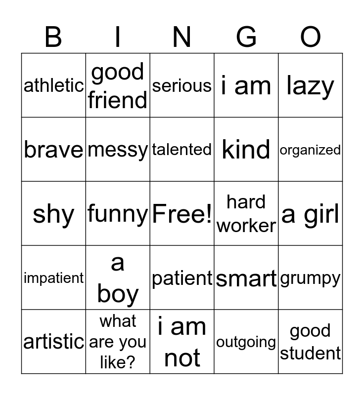 This bingo card has a free space and 24 words: a boy, what are you like?, talented, artistic, lazy, athletic, brave, good friend, hard worker, patient, kind, shy, smart, grumpy, messy, outgoing, a girl, serious, organized, funny, good student, impatient, i am and i am not.