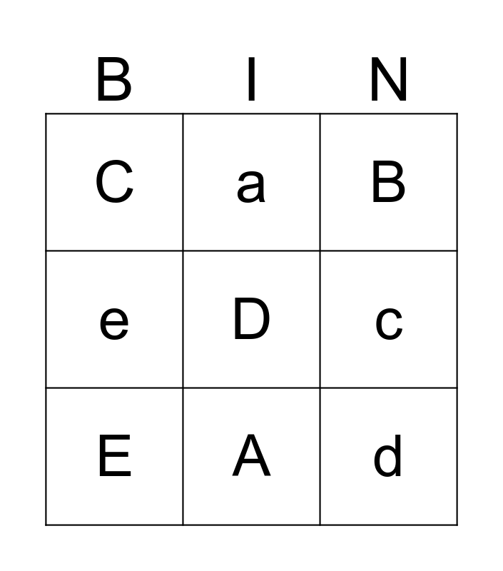 This bingo card has 10 words: A, B, C, D, e, E, a, b, c and d.