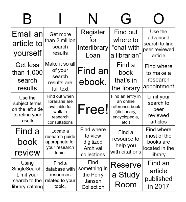 This bingo card has a free space and 24 words: Locate a research guide appropriate for your research topic., Find a database with resources related to your topic., Find an ebook., Using SingleSearch: Limit your search to the library catalog, Use the advanced search to find peer reviewed article, Email an article to yourself, Get less than 1,000 search results, Get more than 2 million search results, Find an entry in an online reference book (dictionary, encyclopedia, etc.), Find where to view digitized Archival collections, Find a book that’s in the library, Use the subject terms on the left side to refine your results, Find a resource to help you with citations, Find where most of the books are located in the library, Make it so all of your search results are full text, Reserve a Study Room, Limit your search to peer reviewed articles, Register for Interlibrary Loan, Find where to make a research appointment, Find out when librarians are available for walk-in research consultations, Find an article published in 2017, Find a book review, Find out where to “chat with a librarian” and Find something in the Perry Jansen Collection.
