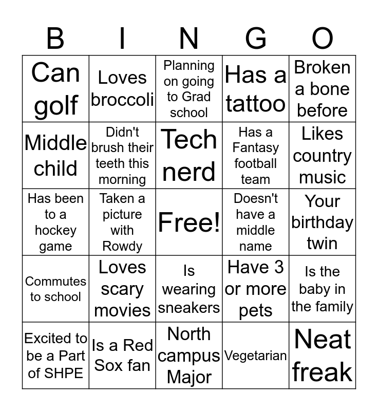 This bingo card has a free space and 24 words: Loves scary movies, Is a Red Sox fan, Tech nerd, Excited to be a Part of SHPE, Broken a bone before, Can golf, Middle child, Loves broccoli, Doesn't have a middle name, Is wearing sneakers, Has a Fantasy football team, Has been to a hockey game, Have 3 or more pets, Is the baby in the family, Didn't brush their teeth this morning, Vegetarian, Your birthday twin, Planning on going to Grad school, Likes country music, Taken a picture with Rowdy, Neat freak, Commutes to school, Has a tattoo and North campus Major.