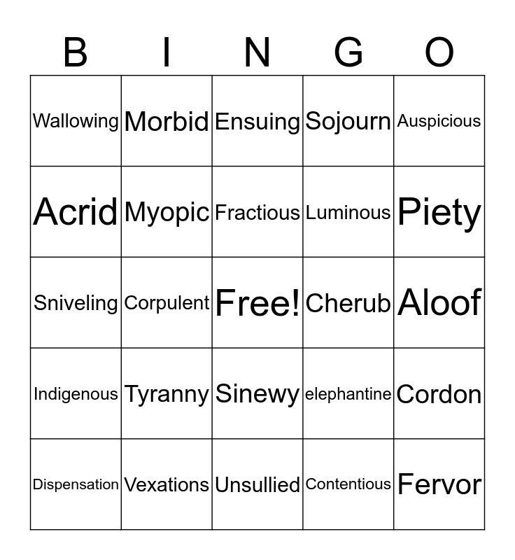 This bingo card has a free space and 24 words: Dispensation, Tyranny, Fractious, Contentious, Auspicious, Wallowing, Morbid, Ensuing, Cherub, Aloof, Sniveling, Myopic, elephantine, Cordon, Acrid, Vexations, Unsullied, Sojourn, Piety, Indigenous, Corpulent, Sinewy, Luminous and Fervor.