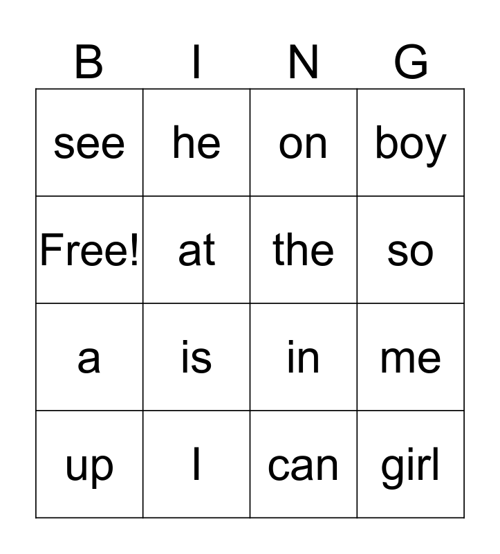 This bingo card has 16 words: I, me, on, see, a, he, in, can, Free!, at, up, boy, is, so, the and girl.