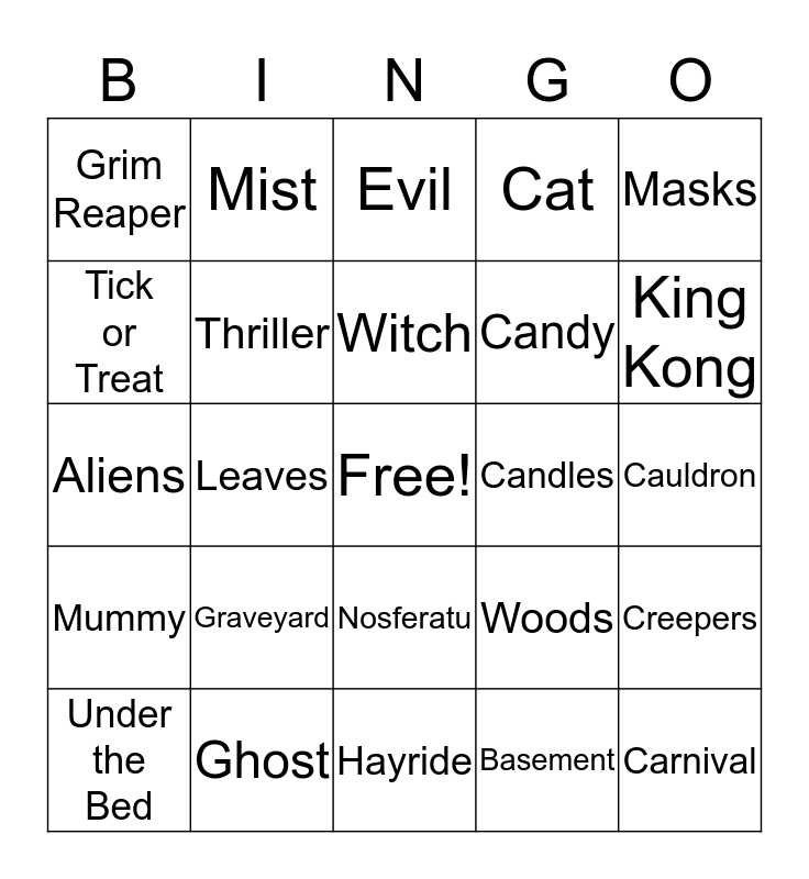 This bingo card has a free space and 41 words: Clown, Aliens, Skeleton, Thriller, Ghost, Nosferatu, Witch, Bats, Masks, Mummy, Leaves, Cat, Carnival, Cauldron, Candles, Graveyard, Jack Pumpkin Head, Grim Reaper, Ghoul, Evil, Creepers, Universal Monsters, Hayride, Candy, Haunted House, Jack-o- Lantern, Basement, Haunt, King Kong, Ghost Busters, Villains, Mist, Under the Bed, Karloff, Woods, Tick or Treat, B Movies, Creature, Scream Queen, Shadows and Penny wise.