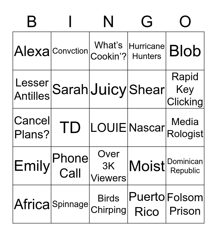 This bingo card has a free space and 24 words: Phone Call, Spinnage, Juicy, Africa, Blob, Alexa, Lesser Antilles, Convction, Nascar, Over 3K Viewers, Shear, Cancel Plans?, Moist, Dominican Republic, Sarah, Puerto Rico, Media Rologist, What’s Cookin’?, Rapid Key Clicking, TD, Folsom Prison, Emily, Hurricane Hunters and Birds Chirping.