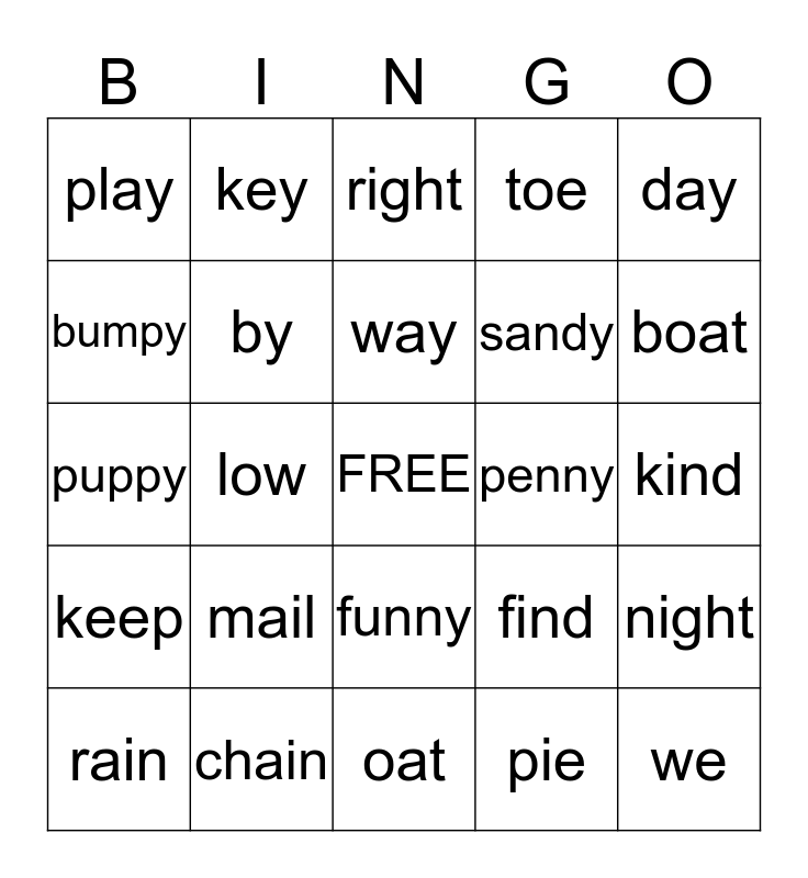 This bingo card has a free space and 24 words: mail, chain, way, rain, day, play, bumpy, key, penny, funny, sandy, puppy, find, night, by, pie, kind, right, boat, low, we, keep, toe and oat.