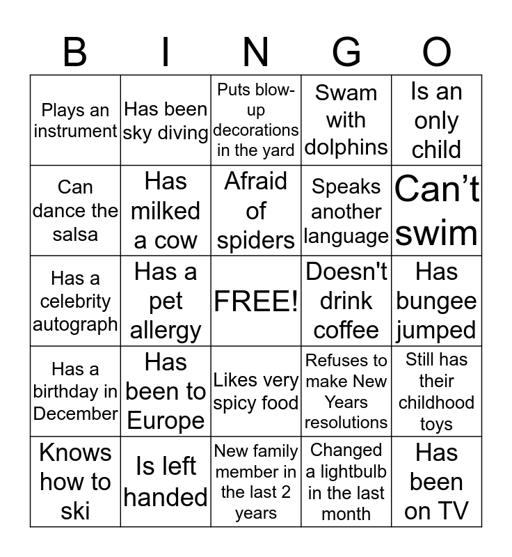 This bingo card has a free space and 24 words: Has been to Europe, Is left handed, Afraid of spiders, Knows how to ski, Is an only child, Plays an instrument, Can dance the salsa, Has been sky diving, Doesn't drink coffee, Likes very spicy food, Speaks another language, Has a celebrity autograph, Refuses to make New Years resolutions, Still has their childhood toys, Has milked a cow, Changed a lightbulb in the last month, Has bungee jumped, Puts blow-up decorations in the yard, Can’t swim, Has a pet allergy, Has been on TV, Has a birthday in December, Swam with dolphins and New family member in the last 2 years.