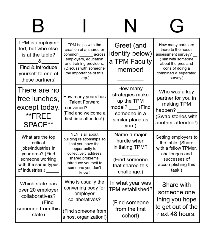 This bingo card has 17 words: In what year was TPM established? _______ (Find someone from the first cohort), Which state has over 20 employer collaboratives? ______ (Find someone from this state), Greet (and identify below) a TPM Faculty member! _______, TPM is employer-led, but who else is at the table? _______&______ Find & introduce yourself to one of these partners!, NLN is all about building relationships so that you have the opportunity to collectively address shared problems. Introduce yourself to someone you don't know!, How many parts are there to the needs assessment survey? __ (Talk with someone about the pros and cons of doing a combined v. separated survey.), Getting employers to the table. (Share with a fellow TPMer, challenges and successes of accomplishing this task.), How many strategies make up the TPM model? ___ (Find someone in a similar place as you.), Who was a key partner for you in making TPM happen? _______ (Swap stories with another attendee!), How many years has Talent Forward convened? ______ (Find and welcome a first time attendee!), Who is usually the convening body for employer collaboratives? ______ (Find someone from a host organization!), Name a major hurdle when initiating TPM? ______ (Find someone that shared this challenge.), There are no free lunches, except today. **FREE SPACE**, TPM helps with the creation of a shared or common ______ across employers, education and training providers. (Discuss with someone the importance of this step.), What are the top critical jobs/industries in your area? (Find someone working with the same types of industries.) _____, What is one piece of advice you give to someone starting TPM? _______ (Swap tips with another attendee!) and Share with someone one thing you hope to get out of the next 48 hours..