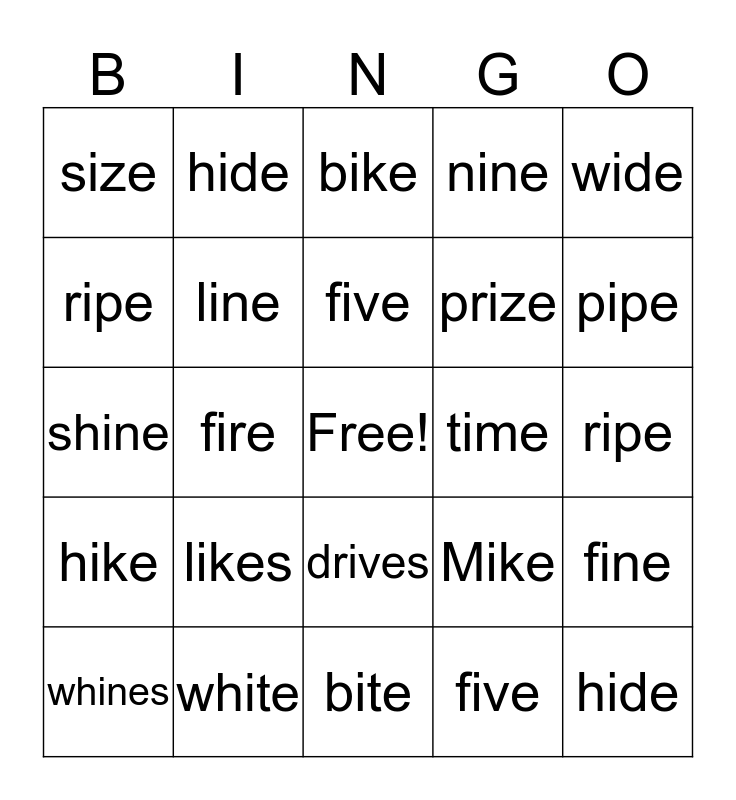 This bingo card has a free space and 24 words: likes, white, five, whines, wide, size, ripe, hide, time, drives, prize, shine, Mike, fine, line, five, ripe, bike, pipe, fire, hide, hike, nine and bite.