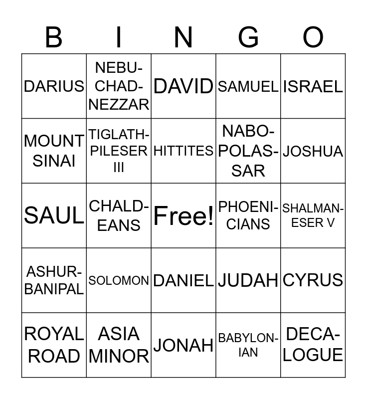 This bingo card has a free space and 24 words: SOLOMON, ASIA MINOR, HITTITES, ROYAL ROAD, ISRAEL, DARIUS, MOUNT SINAI, NEBU-CHAD-NEZZAR, PHOENI-CIANS, DANIEL, NABO-POLAS-SAR, SAUL, JUDAH, CYRUS, TIGLATH-PILESER III, BABYLON-IAN, SHALMAN-ESER V, DAVID, JOSHUA, CHALD-EANS, DECA-LOGUE, ASHUR-BANIPAL, SAMUEL and JONAH.