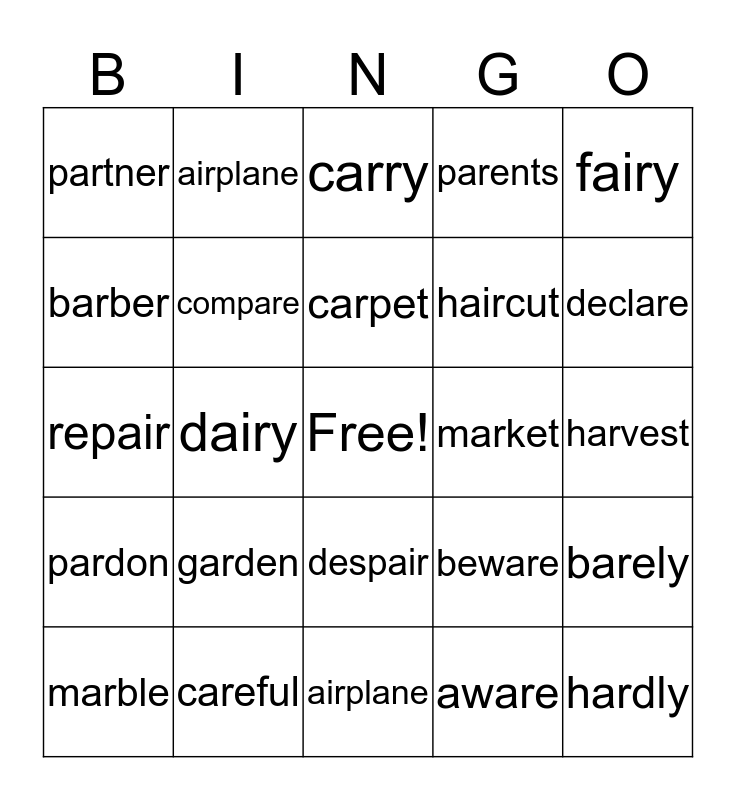 This bingo card has a free space and 24 words: garden, careful, carpet, marble, fairy, partner, barber, airplane, market, despair, haircut, repair, beware, barely, compare, aware, harvest, carry, declare, dairy, hardly, pardon, parents and airplane.