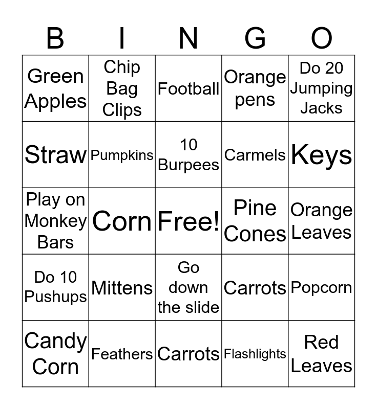 This bingo card has a free space and 29 words: Candy Corn, Acorns, Corn, Red Apples, Green Apples, Football, Pumpkins, Mittens, Pine Cones, Feathers, Orange Leaves, Red Leaves, Carrots, Flashlights, Keys, Take a Swing, Go down the slide, Do 10 Pushups, Do 20 Jumping Jacks, Play on Monkey Bars, Carrots, Run around building like Phoebe, Carmels, Straw, Orange pens, Chip Bag Clips, Popcorn, 10 Burpees and 10 Squats 10 Jacks 10 Burpees.