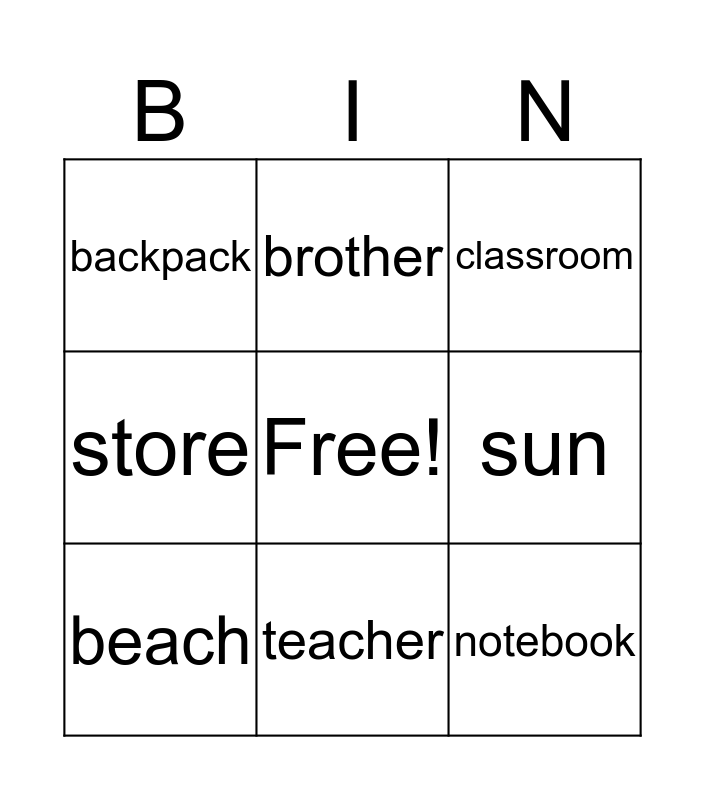 This bingo card has a free space and 8 words: sun, classroom, brother, beach, backpack, notebook, store and teacher.
