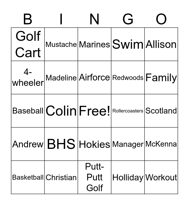 This bingo card has a free space and 32 words: Holliday, Andrea, Colin, Vince, Andrew, Madeline, Allison, McKenna, Mustache, Army, Airforce, Marines, Pilot, Busch Gardens, Rollercoasters, Football, Basketball, Baseball, Hokies, BHS, Manager, Special Olympics, Scotland, Christian, Workout, Swim, Redwoods, 4-wheeler, Golf Cart, Putt-Putt Golf, Germany and Family.